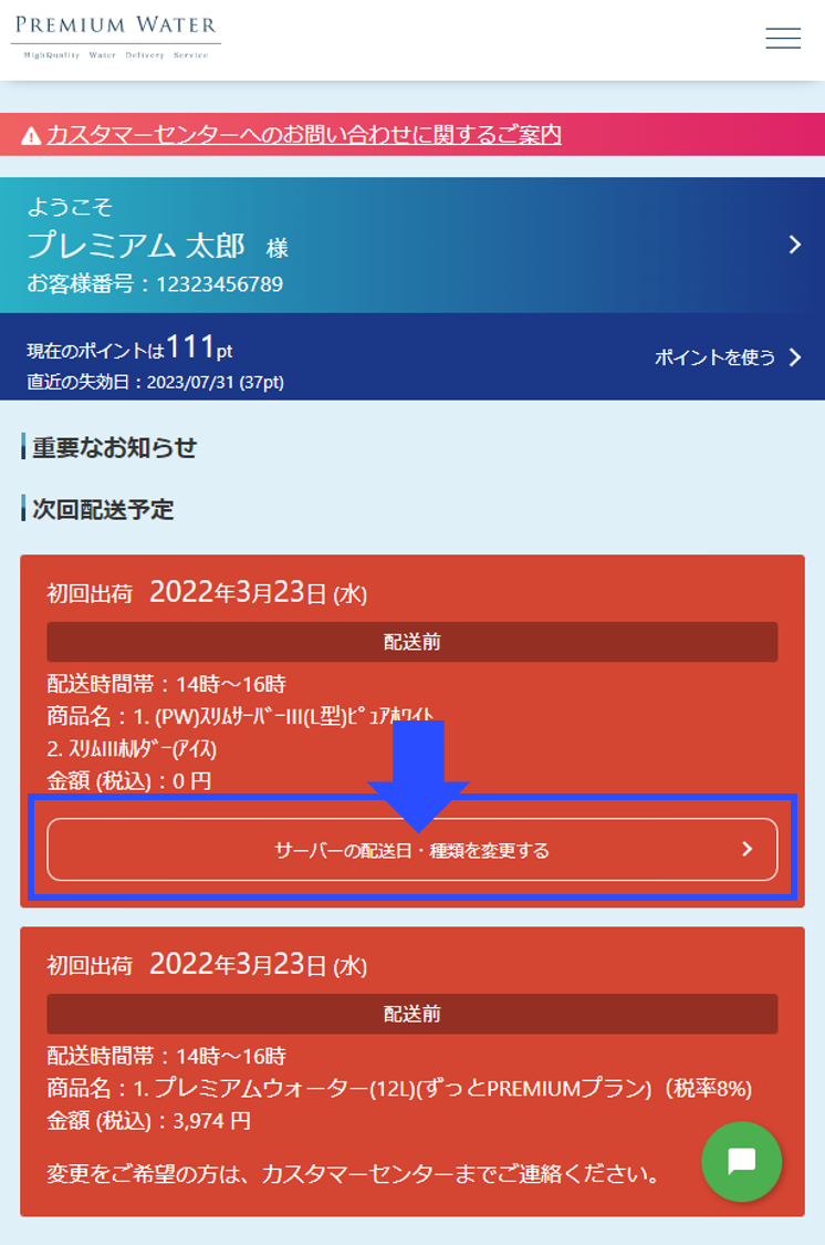 ウォーターサーバーの初回出荷(商品名にサーバー名が表示)をご確認いただき、 「サーバーの配送日・種類を変更する」をタップしてください。