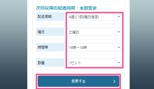 同時に次回以降の配送周期・本数変更もおこなえます。(変更されない場合は、そのまま「変更する」を選択してください。)