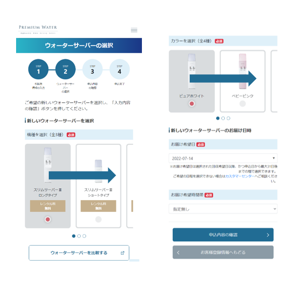 ご希望の新しいウォーターサーバーを選択し、「入力内容の確認」ボタンを押してください。