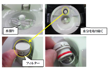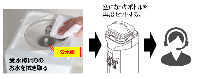 ボトル内のお水の残量が少ない場合、圧が足りず出水しない(出水量が少ない)ことがあります。新しいお水ボトルへ交換をお願いいたします。