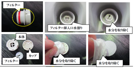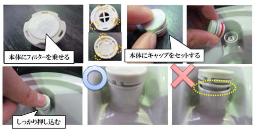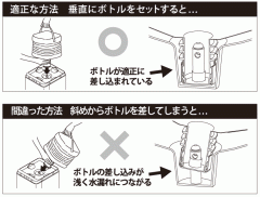 斜めに差し込まれると、本体のボトル差込口(受水棒)とボトルキャップとの装着不備により、送水に不備が生じることがあります。