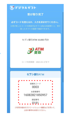 (2)“受け取り完了”の画面に移行し、セブン銀行ATM受取用の下記3点が表示されます。